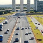 Rua na Asa Norte de Brasília com prédios icônicos e símbolos de corte de água, afetando instituições como Senado e Presidência.